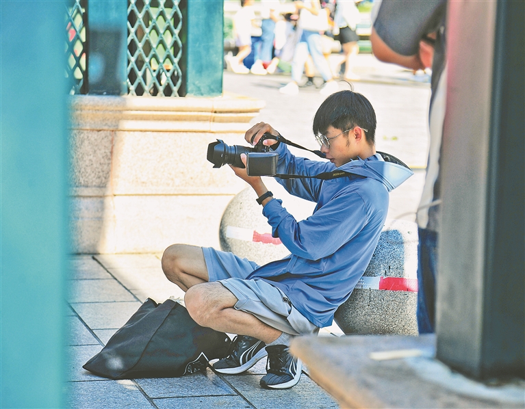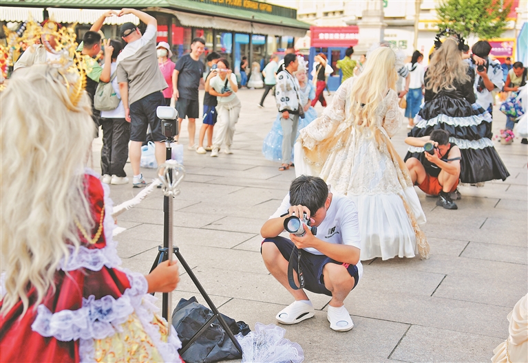 “头再向左转一点儿。”“右手托起和平鸽。”“微笑一下。”人声鼎沸的索菲亚教堂广场上,这边的摄影师大声地引导着拍摄对象,那边的摄影师或蹲、或坐、或躺,用手中的相机把最美的瞬间定格。在拍照最佳点位,“换下一个场景”,这边摄影师话音未落,那边等待的游客一个箭步冲上占位。挎着相机、拉着道具、背着器材的摄影师在人群中穿梭转场,成为一道独特的风景线。