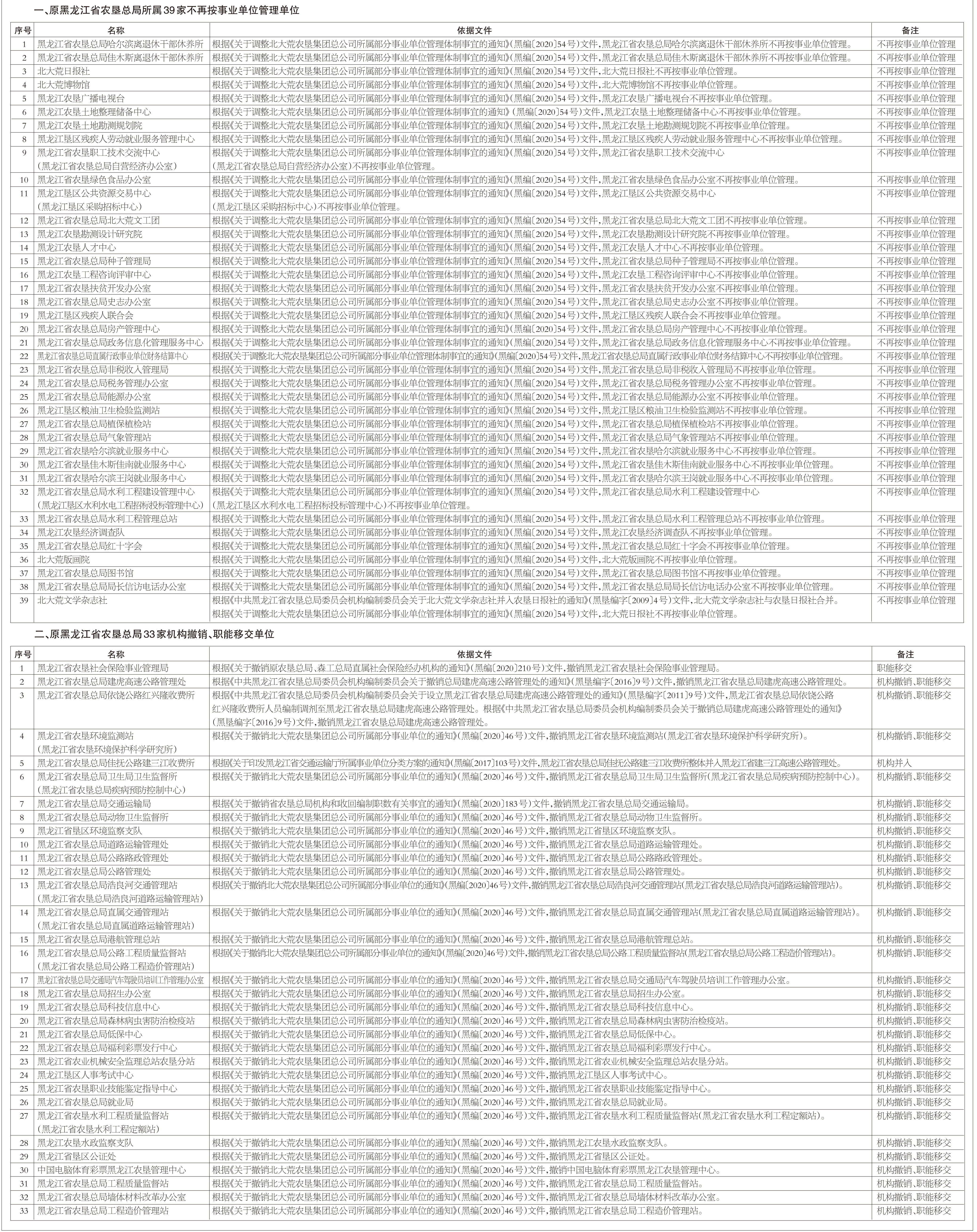 根据黑编〔2020〕46号、黑编〔2020〕54号、黑编〔2020〕150号、黑编〔2020〕183号、黑编〔2020〕210号、黑垦编字〔2016〕9号、黑编〔2017〕103号文件精神和《事业单位登记管理暂行条例》及其实施细则的有关规定,原黑龙江省农垦总局下属部分事业单位拟申请注销登记,现已成立清算组织。请相关债权人自见报之日起90日内向清算组申报债权及办理债权登记手续。债权人申报债权,应当说明债权的有关事项,并提供证明材料。逾期不报,视为放弃权利。清算结束后,本单位将依法向登记管理机关申请注销登记。