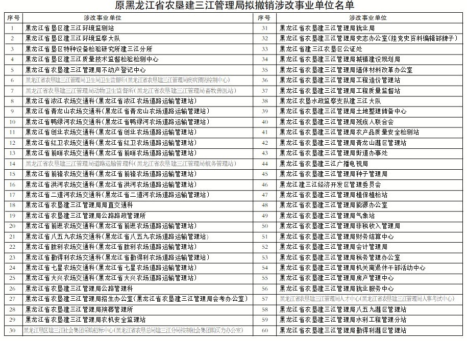 根据黑编〔2020〕46号、黑编〔2020〕54号、黑编〔2020〕150号文件精神和《事业单位登记管理暂行条例》及其实施细则的有关规定,原黑龙江省农垦建三江管理局下属部分事业单位拟申请注销登记,现已开展对涉改事业单位的清算工作并成立清算组,请相关债权人在本公告发布之日起90日内向清算组申报债权并提供证明债权相关材料,逾期未申报的债权,将视为放弃权利。