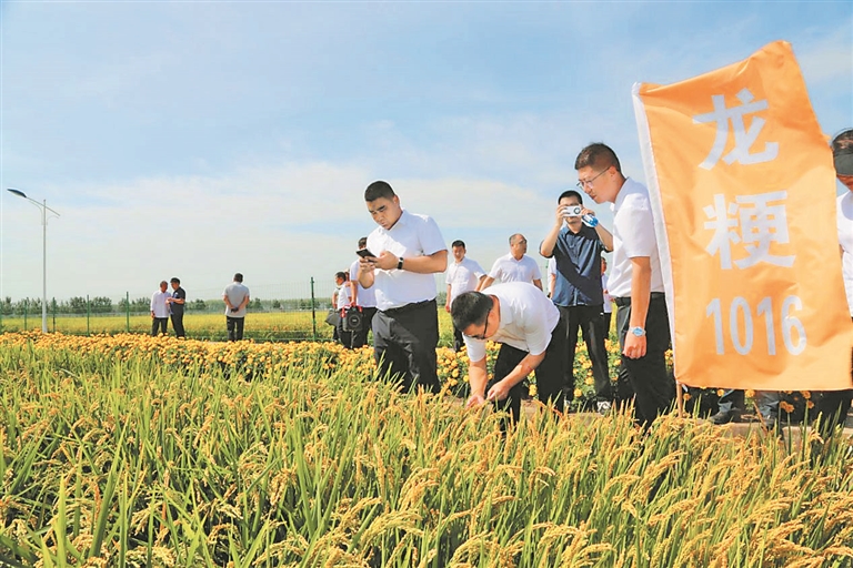 在新品种示范区观摩现场,一望无垠的稻田里,沉甸甸的稻穗挂满了稻秆,优质长粒香稻品种“龙粳308”,糯稻品种“龙粳1016”,早熟丰产优质品种“龙粳113”“龙粳2353”“龙粳4328”等22个参加今年生产试验的水稻品种正式亮相。育种专家现场对不同水稻品种的熟期、抗病性、丰产性、株型、粒型等性状及区域示范情况进行了详细介绍,并引导种子企业、新型经营主体、种粮大户等看稻选种。