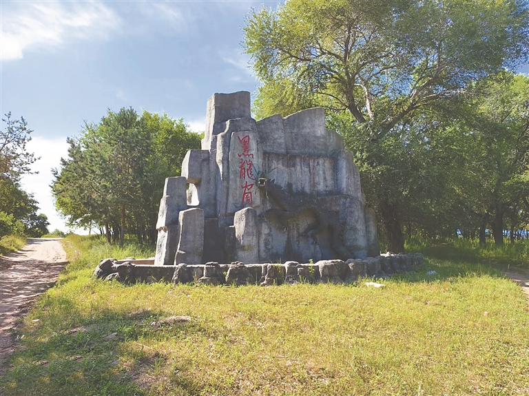 我们的车行驶到黑龙岗北侧停下。黑龙岗东西走向,远看就像横卧在乌裕尔河北岸的一条巨龙,岗上长满了榆树和野草,树丛中有一座水泥制作的假山,假山上雕刻有一条黑色的龙,称作小黑龙,美丽而神秘。民间传说这条小黑龙看到嫩江平原十年九旱,就从小兴安岭开始拱,一直拱到嫩江平原,拱出一条弯弯曲曲的乌裕尔河。从此嫩江平原就风调雨顺,人们开始过上幸福安康的生活。