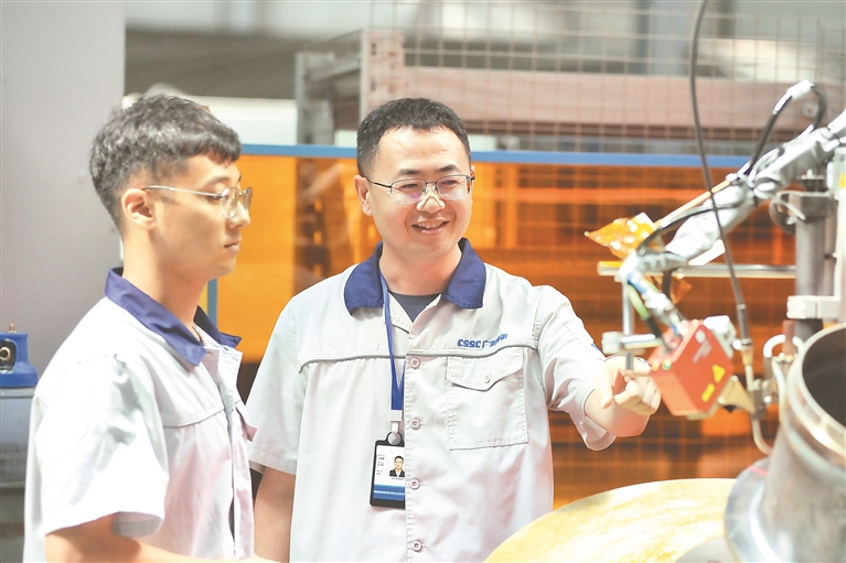 七〇三所燃气轮机事业部高级工程师王继鑫(右)与焊接工程师讨论燃烧室倒流套筒激光辅助引导技术。本报记者 苏强摄