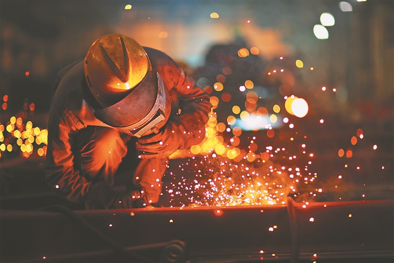 在中车齐车铁路货车组装现场,操作工人正在进行焊接作业。本报记者 孙昊摄