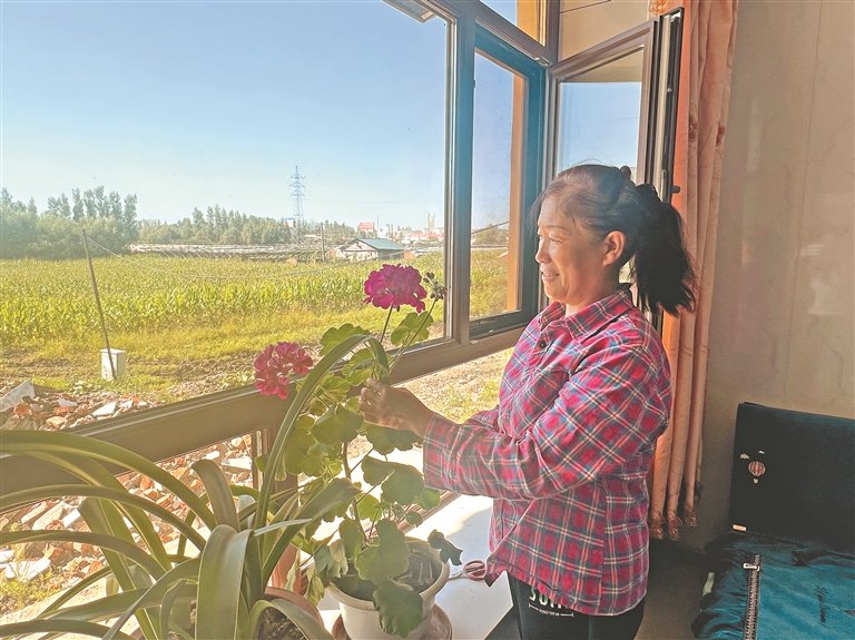 尚志镇城西村村民侯桂红在新房子里侍弄花。本报记者 吴利红摄