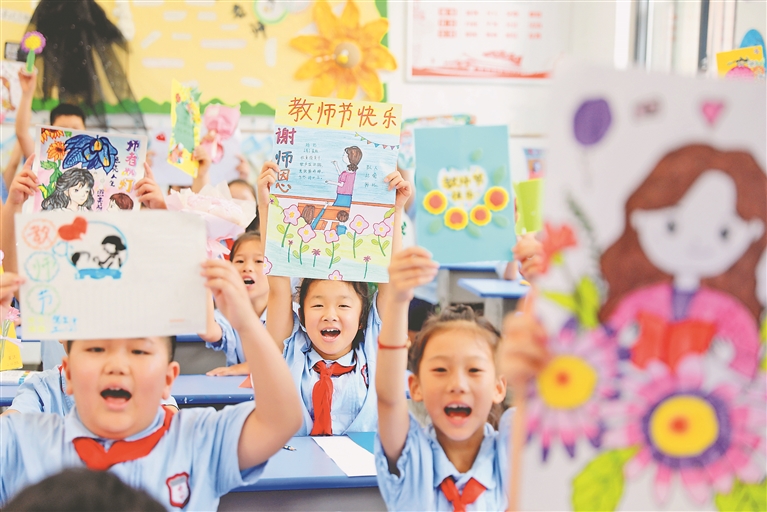 教师节来临,安徽省淮北市泉山路学校学生手工制作贺卡,表达对老师的感谢和祝福。