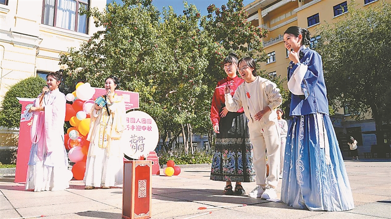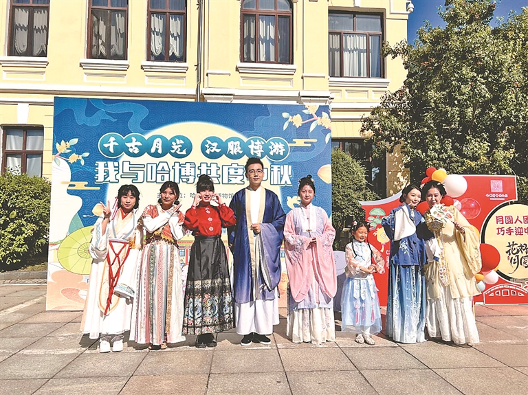 在哈尔滨市博物馆院内,一场精彩的汉服秀吸引了众多市民和游客的目光。讲解员们身着汉服,端庄优雅、灵动飘逸,展示着中华传统服饰之美,并热情邀请游客共同参与中秋活动,感受传统文化的魅力。