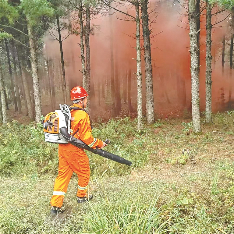 演练现场模拟突发火情的应急处置措施,演练人员按照应急预案流程,进行火灾通报、人员调度、应急响应,迅速开展灭火救援工作。在模拟火灾现场,40名半专业扑火队使用风力灭火机在火场周边快速开辟突破点,沿火线两侧推进,根据火势大小、风向变化和地形条件等因素灵活调整灭火战术和人员力量部署。前线作战和后方调度密切协同,有效控制了现场火势,成功扑灭“山火”。