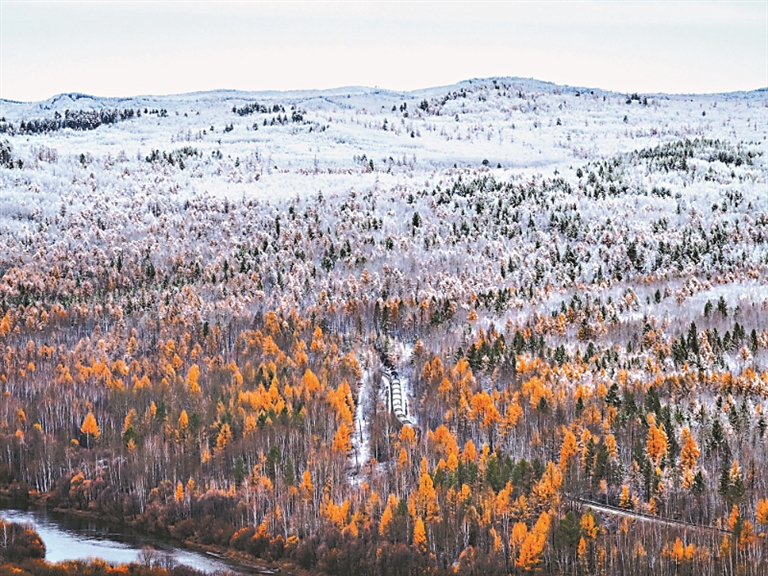 从空中俯瞰最北边城俨然已经进入冬季。眼下正值漠河的金秋时节,突如其来的降雪为北国秋色增添了别样美景。松枝上布满了厚厚的雪球,山林之间的秋色景观与皑皑白雪同框,火车在白雪森林间穿行而过,令南方游客惊叹不已。本报记者 张磊摄