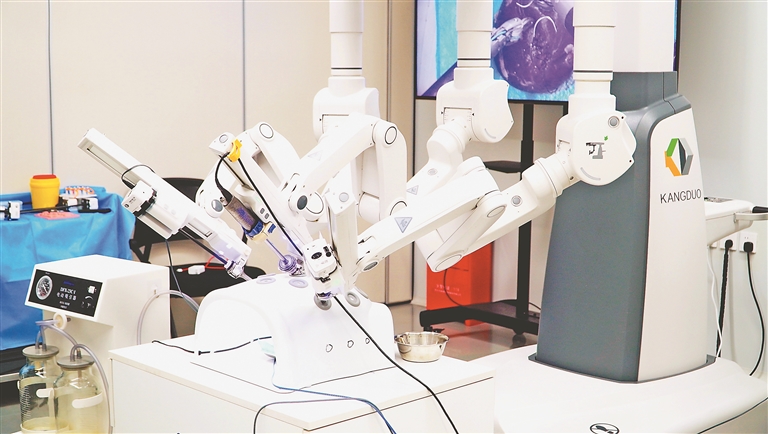 思哲睿自主研制的腔镜手术机器人在作业中。