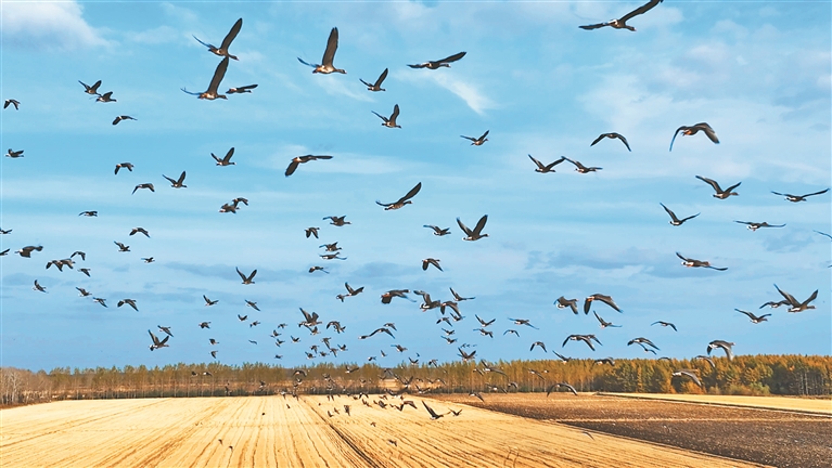 本报讯(李会 万鹏 记者刘畅)近日,在北大荒集团云山农场第五管理区一块已经完成水稻收获的地块里,数千只迁徙的大雁在其中嬉戏、飞舞、觅食,构成一道秋季靓丽生态风景线。