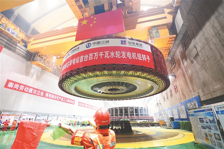 白鹤滩右岸电站首台百万千瓦水轮发电机组转子吊装。本报记者 郭俊峰摄