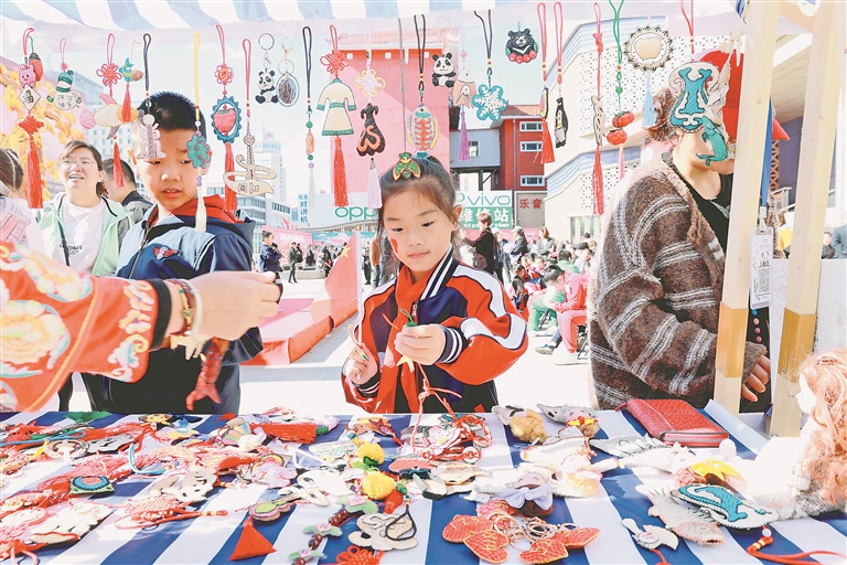 孩子们对赫哲族非遗作品产生浓厚兴趣。
