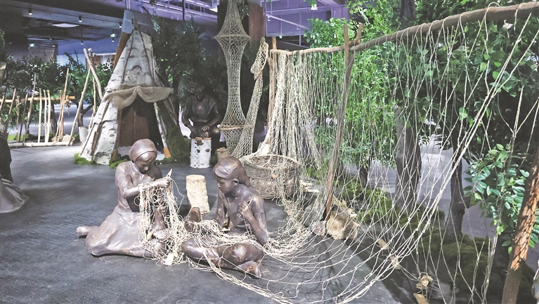 赫哲风情旅游景区游客服务中心内,长44米、高4.4米的巨型鱼皮画《赫哲百态图》犹如一幅“清明上河图”,栩栩如生地展示了赫哲人一年四季的生产生活场景。这幅巨作使用了21852块大马哈鱼皮,是世界最大的鱼皮画之一。赫哲族非物质文化遗产传承中心内,展示了赫哲族人生活服饰、渔猎工具、祈福用具等“老物件”,生动逼真演绎了赫哲族的渔猎文化和发展历史,充满了原始质朴的美感。
