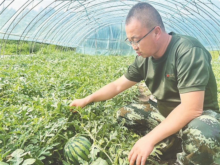 叶雷查看西瓜长势。