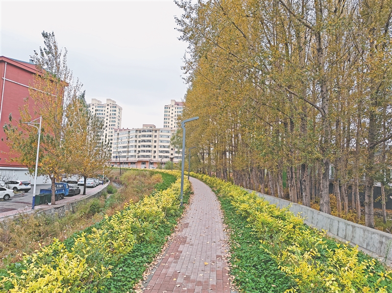 改造后的人行道宽1.6米、长630米,铺设了红色道板砖,宛如一条彩带镶嵌在绿地之间,人行道两侧,还精心种植着多种绿色植被,为这片区域增添了生机与活力。