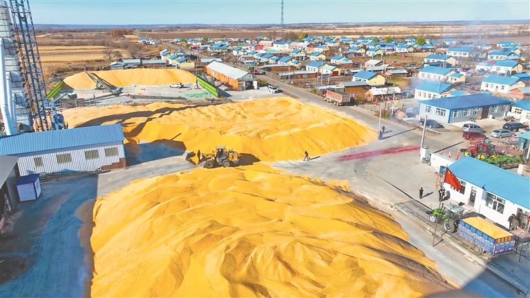 近日,爱辉区秋粮收购全面开秤,全区30多家粮食经营主体同时开库,为农民提供就地烘干、代储、代卖等服务,确保秋粮及时颗粒归仓,收储能力达130万吨。图为爱辉区益海农业种植专业合作社院内堆积的“粮山”。