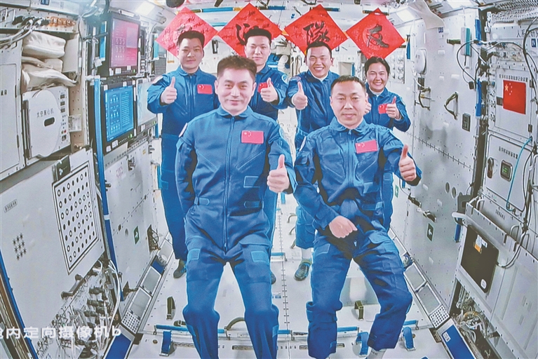 在载人飞船与空间站组合体成功实现自主快速交会对接后,神舟十九号航天员乘组从飞船返回舱进入轨道舱。北京时间2024年10月30日12时51分,在轨执行任务的神舟十八号航天员乘组顺利打开“家门”,欢迎远道而来的神舟十九号航天员乘组入驻中国空间站,“70后”“80后”“90后”航天员齐聚“天宫”,完成中国航天史上第5次“太空会师”。后续,两个航天员乘组将在空间站进行在轨轮换。其间,6名航天员将共同在空间站工作生活约5天时间,完成各项既定工作。新华社记者 李杰摄
