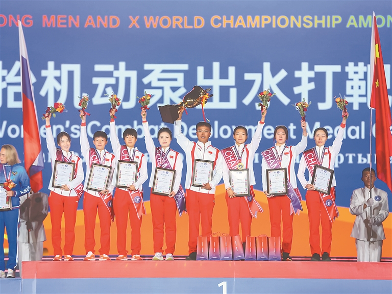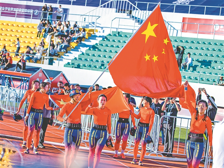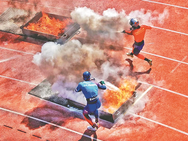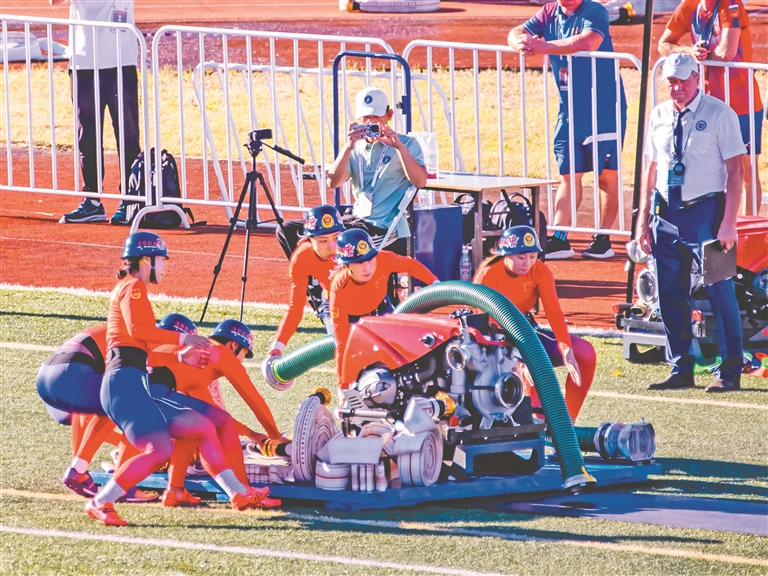 在男子4×100米消防接力比赛中,中国队员不畏强手、配合默契,行云流水、一气呵成,以55秒62的成绩跑出“中国速度”,斩获中国队在此项目上的首枚金牌。男子手抬机动泵出水打靶比赛中,7名参赛队员团结协作、流畅发挥,以27秒72的成绩勇夺银牌。女子4×100米消防接力比赛,两组队员沉着应战、稳扎稳打,圆满完赛,积累了宝贵经验。