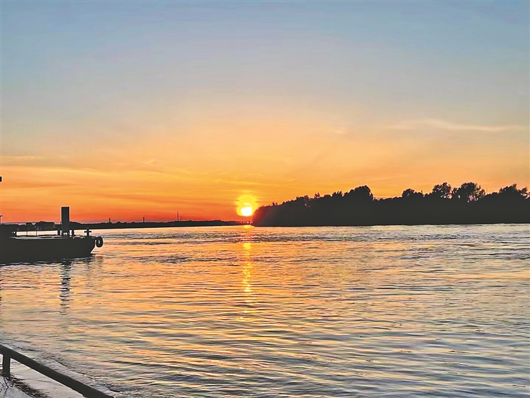红彤彤的落日染红了西边的苍穹,但同时它也被一缕缕云彩分隔成一条条光带。尽管遭到云彩的禁锢,夕阳仍倔强地将余晖从云缝中投射出来,就像给云层镶了一道金边,颇有一种“莫道桑榆晚,为霞尚满天”的韵致;其又好似在波光粼粼的水面上洒了一把金屑,真个是“一道残阳铺水中,半江瑟瑟半江红”呀。此时,远处翱翔的白鹭不禁让我想起“落霞与孤鹜齐飞,秋水共长天一色”,而江上的孤舟又将古筝曲《渔舟唱晚》送入我的耳畔。望着水天一色和孤帆远影,朦胧间,我一边想象着赫哲人划着桦皮船捕鱼的场景,一边情不自禁地哼唱起《乌苏里船歌》:赫哲人撒开千张网,船儿满江鱼满舱……