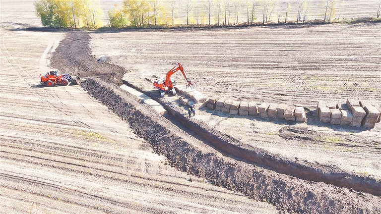 为了治理好侵蚀沟,保护珍贵的黑土地,今年,鹤山农场将秋收后的农作物秸秆打包,采取“就地取材、就近治理”的原则,降低运输、装卸等费用,提高机械化作业效率。为了加快治理进度,提前对侵蚀沟进行开槽、修坡、整型,在沟内铺垫一层碎石,再进行秸秆打捆回填,从源头治理修复土地“疮疤”。
