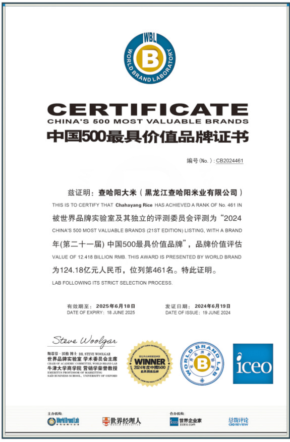 用品质做口碑、树品牌。今年6月,中国500最具价值品牌榜单发布,“查哈阳大米”以124.18亿元的品牌价值位列第461位……这是农场深耕品牌市场的有力见证。