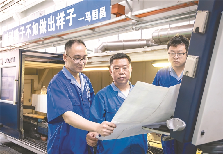 现任马恒昌小组组长马兵(左二)带领组员开发新型刀具,改进加工方法。图片由受访单位提供