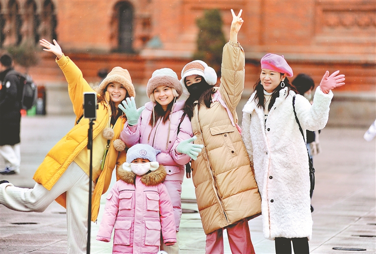 近日,哈尔滨市道里区江畔、中央大街等地,来自南方的“小金豆”游兴正浓,各景区游客数量不断增多。这些南方游客大都穿着浅色羽绒服,戴着可爱的绒帽,有的跟团游,有的自由行。他们品尝着“尔滨”特色美食,观赏着秋末冬初的美丽风景,用手机记录下一个个精彩瞬间。