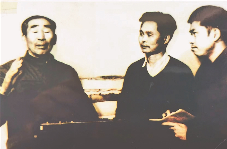 伊玛堪老歌手葛德胜(左一)向采录者韩福德、黄任远讲述伊玛堪故事。么福祥摄