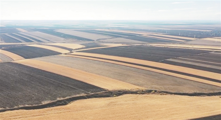 已完成收割的地块,大型农用机械轰鸣往返,牵引着铧式犁穿梭在田间,所到之处,黝黑发亮新鲜的泥土被翻到地表,粉碎的秸秆和地表泥土一同被翻入深处。