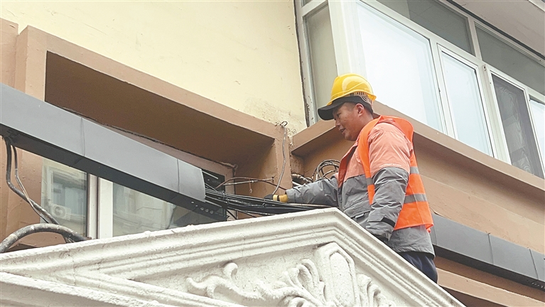 在红专街,空中线缆规范治理也在同步进行。记者看到,工人们正在对杂乱的线缆进行梳理捆扎,然后用黑色线盒固定在楼体上,规范有序、整齐美观。“通过治理进一步解决空中线缆架设不规范、杂乱无序、废弃线缆清理不及时等问题,着力营造规范、整洁的城市空中环境秩序。”李冬雪介绍。