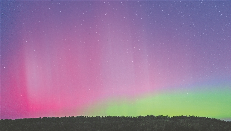 时间一分一秒过去,手机上的时间指向了晚上10点。就在我们几乎要放弃的时候,天边突然出现了一抹粉色的光带。它如极地的精灵在最北的苍穹跳跃。似彩练舞动,如梦幻流淌,编织着宇宙神秘的乐章。我激动得心跳加速,目不转睛地盯着那片光芒,生怕错过任何一个瞬间。在这里守候北极光的媒体记者和外地的游客被这一幕深深震撼,纷纷拿起手机、相机,记录下这难忘的瞬间。大家指挥车辆将大灯熄灭,将手机调成“夜间模式”,快速捕捉画面,将梦幻多彩的北极光画面定格成永恒。