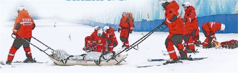 雪域救援演练模拟雪场因天气突变,突发暴风雪导致有人员被雪埋压和在雪道受伤场景,重点检验雪域救援专业队极端天气条件下的滑雪技术和快速搜救、安全转运能力。