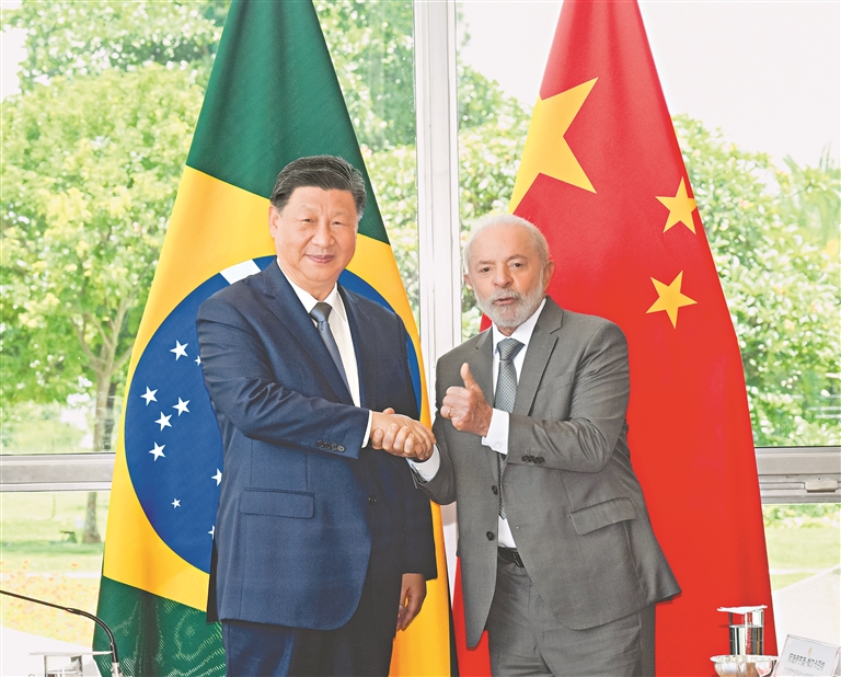 习近平指出,很高兴在中巴建交50周年这个具有重要历史意义的年份访问巴西。刚才卢拉总统为我举行最高礼遇的隆重欢迎仪式,充分体现了对中巴关系的高度重视以及对中国人民的深情厚谊,令我深受感动。中国和巴西是东西半球两大发展中国家。回首过去50年,中巴关系跨越山海,探索出发展中大国相互尊重、互利友好、合作共赢的正确相处之道。巴西是首个同中国建立战略伙伴关系的国家、首个同中国建立全面战略伙伴关系的拉美国家。近年来,在我和卢拉总统战略引领下,两国日益成为命运与共的可靠朋友、共促和平的积极力量,中巴关系正处于历史最好时期,不仅增进了两国人民福祉,也维护了广大发展中国家共同利益,壮大了全球南方的力量和声音,为世界和平稳定作出突出贡献。