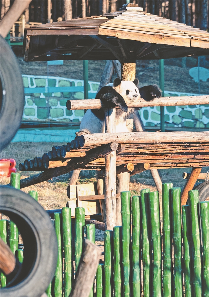 近日,亚布力旅游度假区滑雪的游客量逐渐增加,在亚布力熊猫馆,憨态可掬的熊猫思嘉将可爱的一面展露给前来观光的游客,思嘉爬上木梯,上身扶着栏杆,下身展示标准大劈叉,望向落日的方向,灵动的双脚不时点着“节拍”,萌态十足。