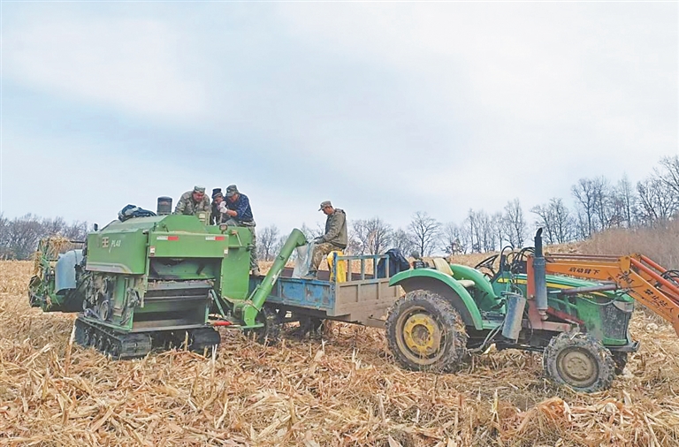 在收割现场,一排排谷子被卷进机械车里。经营所全体干部职工分工协作,不一会儿,大粒饱满的谷穗“尽收囊中”。收获的小米倾泻而下,将农用车装得满满当当。