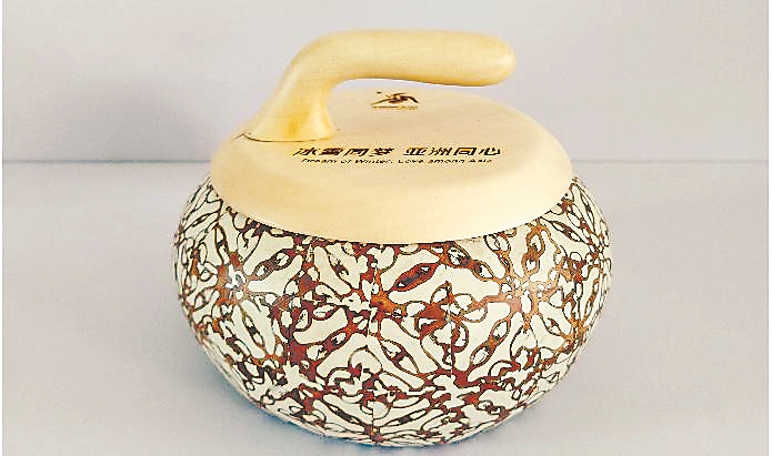 一款冰花壶收纳罐以冰壶为造型设计,以小兴安岭山核桃皮制作壶体,实木制作壶盖,上面带有本次亚冬会标志和口号,突出亚冬会主题。山核桃切片造型结合白色填充,像一朵朵雪花堆落而成,充分展现了木艺文化艺术与竞技体育相融合的发展理念,是不可多得的艺术珍品。