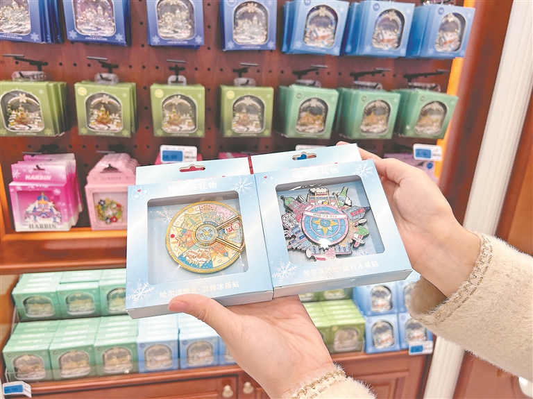 “现在很多文创旅游纪念品都对功能性进行了开发,比如冰箱贴,不仅具有冰箱贴的功能,还可以当摆件,尤其通过AR增强现实虚拟技术欣赏黑龙江的四季变换,高科技赋能的冰箱贴虽然价格不菲,却非常受欢迎,其中一款爆款‘玩转哈尔滨’主题的冰箱贴总是卖断货。”“黑龙江礼物”主播刘小萱介绍。