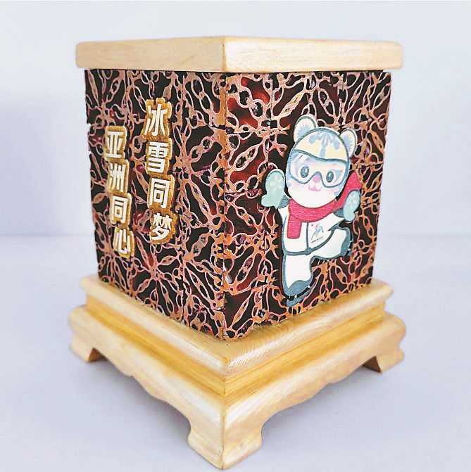 刚刚上市不久的几款雕刻产品把亚冬会元素展现得惟妙惟肖。其中一款山核桃笔筒以小兴安岭山核桃皮和珍贵树种红松为原料,结合非遗工艺精制而成。该作品以本次亚冬会吉祥物和标志为主题,展现出本届亚冬会非遗特色,充分体现出冰雪经济和木艺创意设计产业的发展成果。