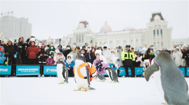 26日,哈尔滨极地公园的“淘学企鹅”,今冬首次外出“打卡”,10只企鹅迈着小碎步来到索菲亚教堂广场,召开首场巡游粉丝见面会。游客们兴奋地说:“特别幸运,没想到在这儿就看见了‘淘学企鹅’,哈尔滨真是太宠粉了。”