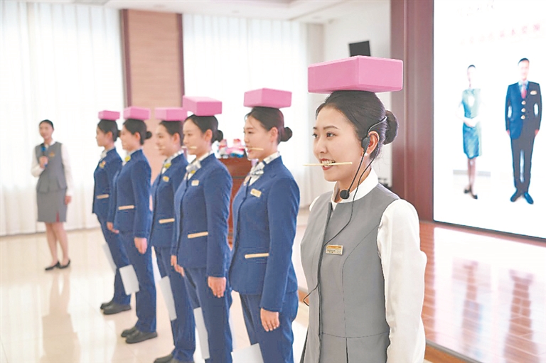 高铁乘务员接受礼仪培训。图片由哈尔滨客运段提供