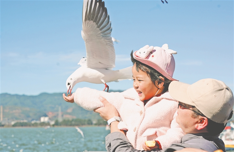 12月1日,一名小朋友在昆明滇池海埂观景大道投喂红嘴鸥。