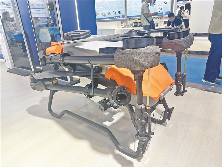 “我们将北斗、物联网、人工智能等多种技术深度融合并应用于农业场景,自主研发并生产了一系列智能农业装备,产品覆盖耕、种、管、收全流程。这款HD580农业无人机作业效率非常高,每分钟300公斤的下料速度,每分钟40升的喷洒速度,相比上一代产品作业效率翻了一倍。”公司高级销售总监刘尧益说。
