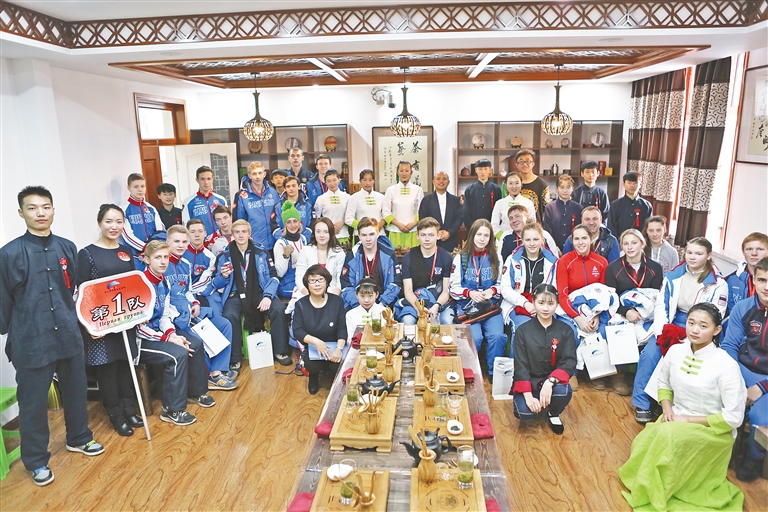 中俄文化交流,俄罗斯冰雪运动少年与哈尔滨冰雪运动学校学生进行茶艺文化交流。
