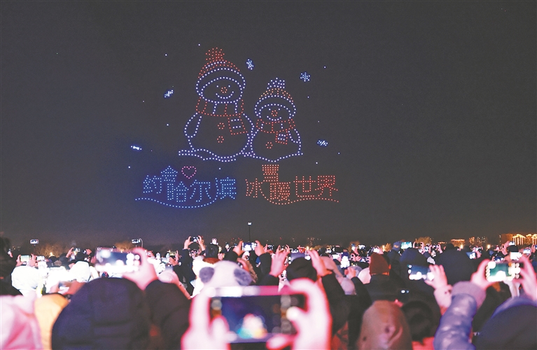 无人机通过不断变化的阵型排列,展现第二十六届哈尔滨冰雪大世界的主题、主形象大门、采冰工人等画面,为市民和游客带来一场集艺术与科技于一体的视觉盛宴。