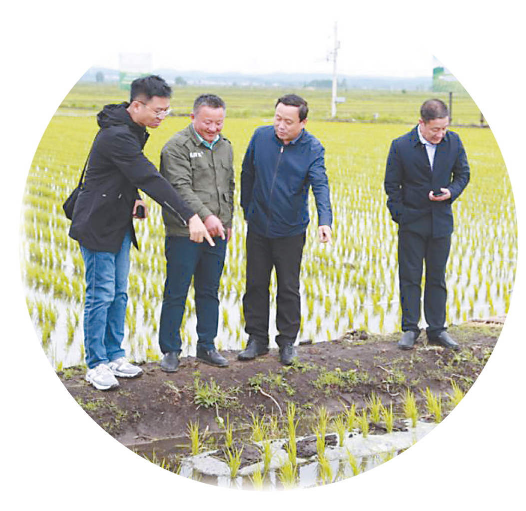 体系专家查看应用起垄覆膜种稻技术的秧苗生长情况。资料片