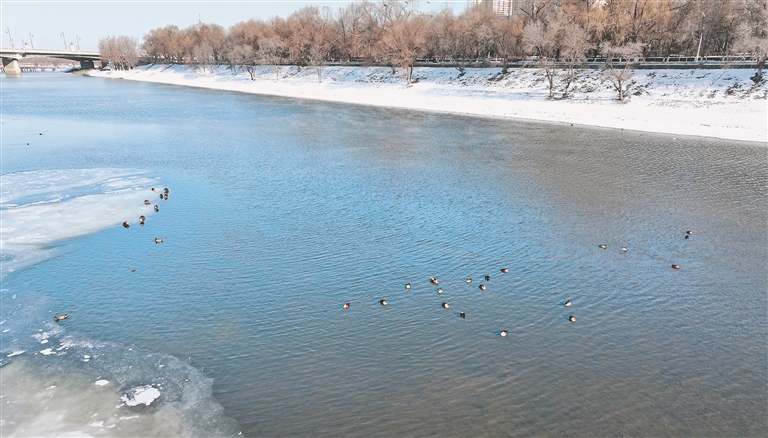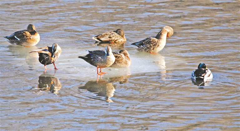 12月12日,哈尔滨市何家沟入江口处,50余只野鸭在此栖息。它们有的趴在何家沟的冰面上休息,有的在水中游弋,有几只一次次把头扎进水中觅食。 这些鸟多数为绿头鸭,还有一部分斑嘴鸭。
