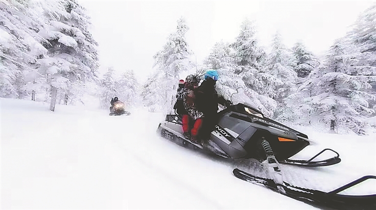 我们正静静地欣赏着,不忍离去,一阵喧闹声从远处传来。抬眼望去,两辆雪地摩托艇在树林间逶迤穿行,摩托后面荡起一缕雪烟,留下一阵欢快的笑声。刘爽说,这是雪地摩托,是年轻人的最爱。骑上它,在林间穿行,感受速度与激情,飞速之间,山峰倾倒,林海后退,只有青春与激情在林海雪原上飞翔。听小刘一说,我们也动心了。刘爽笑着摆手说,别急,一会儿我们乘坐“雪龙飞车”下山,“雪龙飞车”是由游客自己驾驶,利用山体的坡度产生冲击力,一样的惊险刺激。你想,一条巨龙在林海里穿行,那场面多壮观啊!