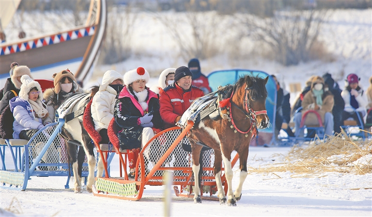 近日,冬天的哈尔滨市伏尔加庄园,游客络绎不绝。来自各地的游客专程到冰城游玩,感受冬天的趣味。南方游客们乘坐马拉爬犁与雪橇列车在阿什河上驰骋,大家在这座充满魅力的庄园中,玩雪戏雪,快乐翻番。本报记者 张澍摄