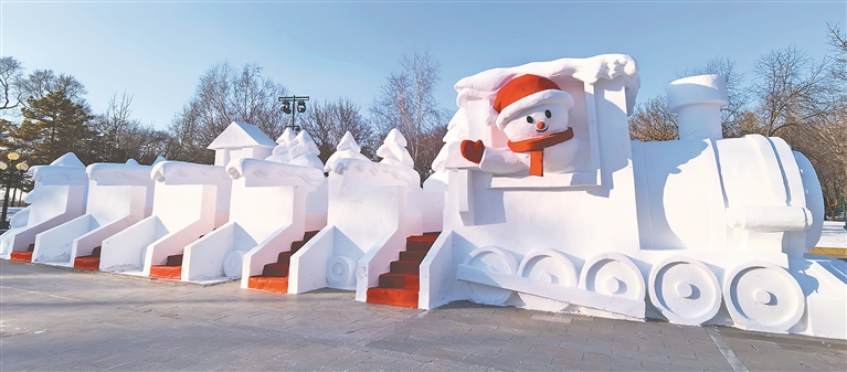 园区内,一座座雪雕作品宛如梦幻中的雪域城堡拔地而起。下了太阳桥,道路一侧的雪雕《亲亲雪人》正在雕刻中。这个雪雕由两个憨态可掬的雪人组成,它们沉浸在彼此的亲密互动中。雪人头顶鲜艳的红帽子,圆润的头部轮廓在雕刻师的巧手下逐渐清晰。另外一侧是已经雕刻完成的《亚冬列车》,车头的小雪人挥着手,仿佛在召唤游客搭乘亚冬会的列车。