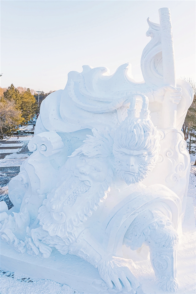 面部表情栩栩如生,双眸炯炯有神,霸气十足……这是雪雕《悟空归来》给人的震撼印象。“我们团队由20人组成,其中包括5名雕刻师,以及其他多个工种的同仁。自12月3日起,全身心投入到这项创作中。”雕刻师吴振胜介绍,《悟空归来》高20米,用雪量约2400立方米,13日竣工,14日他们开始雕刻《八骏踏雪》。